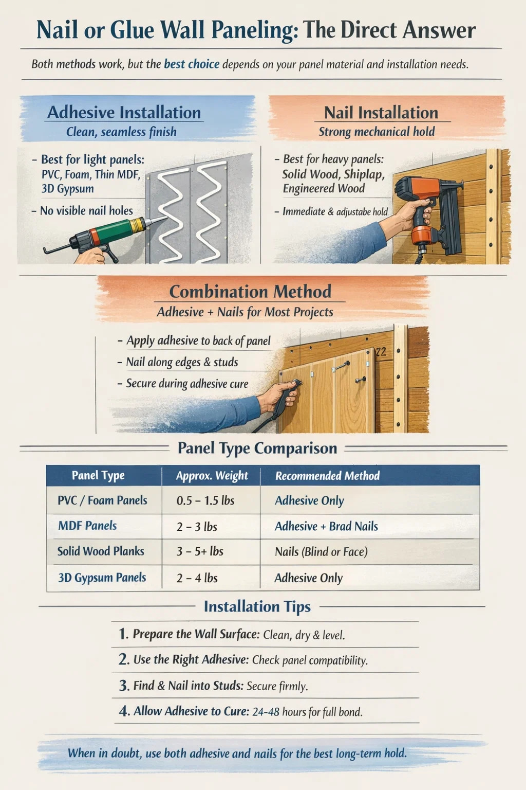 Чтобы наглядно свести все воедино: для большинства декоративных стеновых панелей использование одновременно клея и гвоздей является наиболее надежным подходом. Клей подходит только для легких декоративных панелей из ПВХ, пенопласта и полиуретана, где материал панели несовместим с гвоздями или где требуется совершенно чистая поверхность без крепежных элементов. Сами по себе гвозди подходят для шпунтованных досок из массива дерева, где забивка вслепую скрывает все крепления, или для любой установки поверх полос обрешетки, где приклеивание к каменной кладке нецелесообразно.