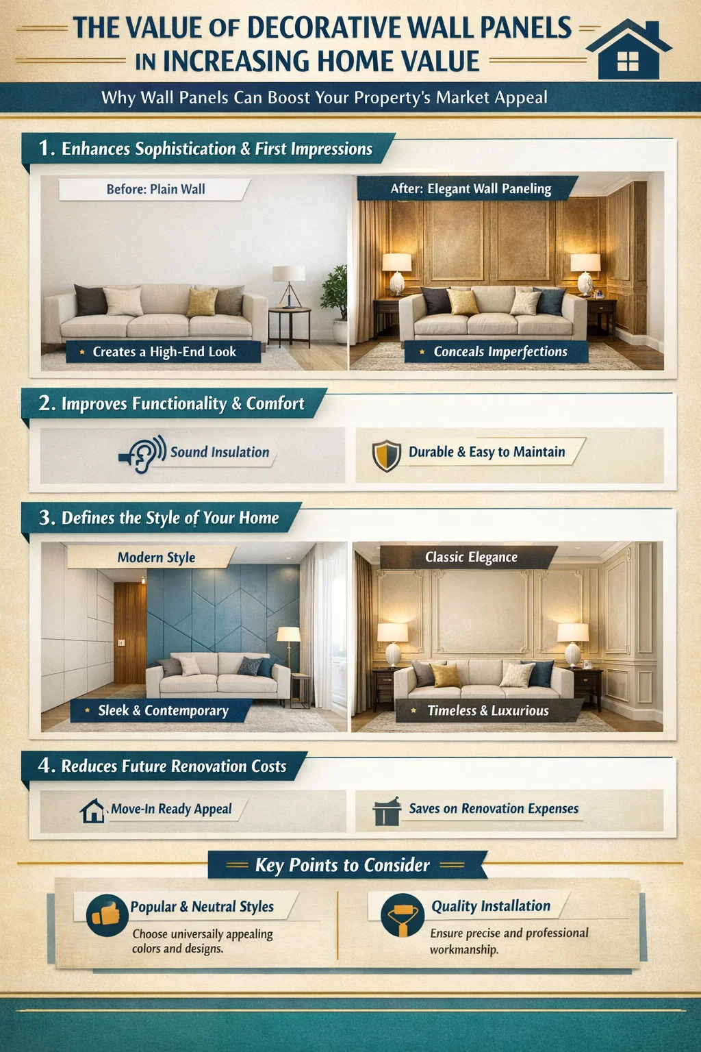 Многие домовладельцы задумываются, является ли установка декоративных стеновых панелей простыми расходами или инвестицией, которая может увеличить стоимость недвижимости. Вообще говоря, хорошо спроектированные стеновые панели действительно могут повысить рыночную привлекательность недвижимости.