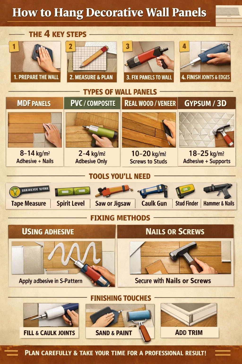 Подвешивание декоративных стеновых панелей сводится к четырем основным этапам: подготовить поверхность стены, измерить и спланировать планировку, применить выбранный метод крепления (клей, гвозди или их комбинацию) и обработать стыки и края. Самый стандартный Декоративные стеновые панели из ПВХ, МДФ или дерева. может быть установлен одним человеком за выходные с использованием базовых инструментов. Сделайте эти четыре шага правильно, и вы получите результат, который будет выглядеть профессионально и прослужит долгие годы.