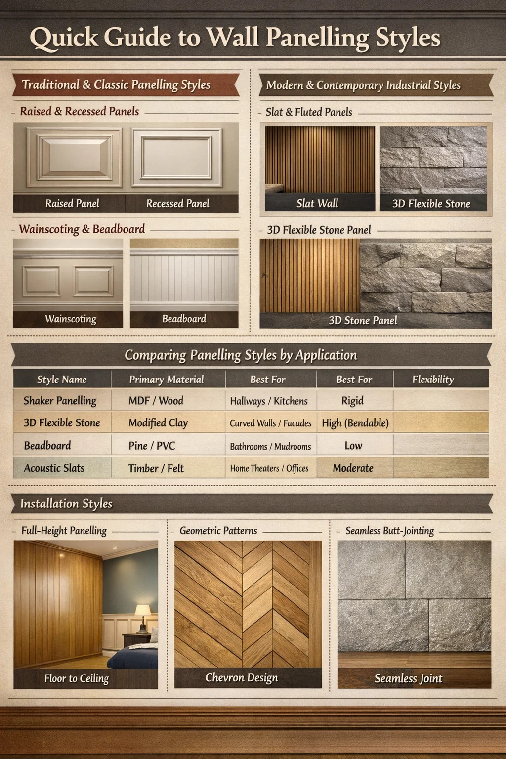 Мир дизайна интерьеров предлагает широкий выбор вариантов отделки стен: от традиционных Поднятые панели и Обшивка к современным, высокотехнологичным решениям, таким как 3D-гибкая каменная стеновая панель . Чтобы выбрать правильный стиль, вы должны сбалансировать архитектурную эпоху вашего объекта с желаемой тактильной текстурой и требованиями к уходу за материалом.