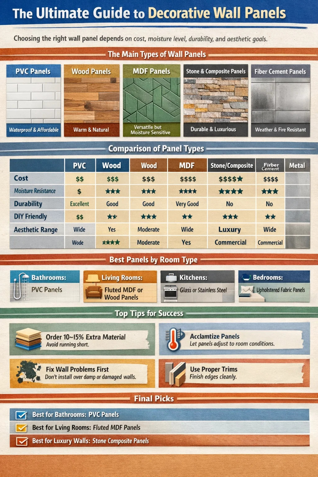 Не существует одной «лучшей» декоративной настенной панели, подходящей для любой ситуации. Правильный выбор зависит от уровня влажности в вашей комнате, вашего бюджета, внешнего вида, который вы хотите получить, и объема обслуживания, который вы готовы выполнять в долгосрочной перспективе. Тем не менее, Стеновые панели ПВХ – самый универсальный вариант. для большинства домовладельцев — они водонепроницаемы, доступны по цене, просты в установке и доступны в сотнях стилей. Если вам нужен премиальный вид для гостиной или спальни, декоративные стеновые панели из дерева или МДФ эстетически превосходят все остальное. Для коммерческих помещений или мест с интенсивным движением транспорта каменные композитные и фиброцементные панели трудно превзойти по долговечности.