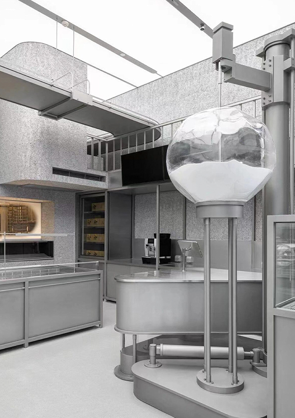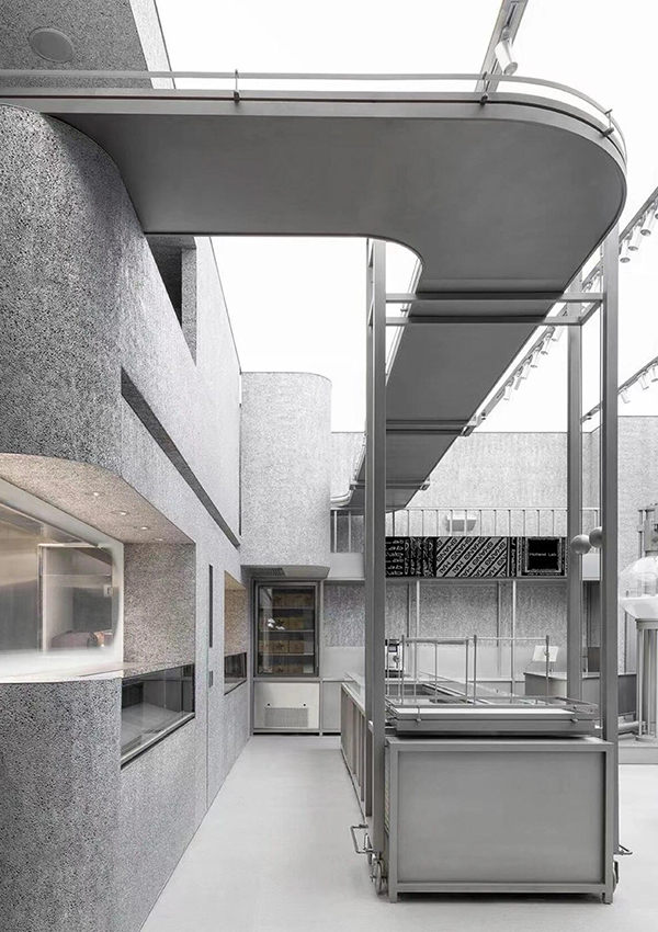 Серебристый металлический блеск и текстура камня образуют естественный переход световых и теневых эффектов, ослабляя монотонность промышленных материалов и повышая трехмерный уровень пространства.